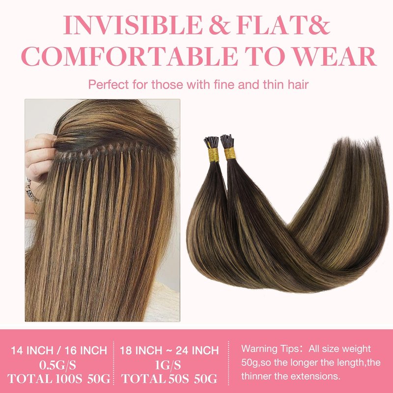 - Fit Weight & Versatile Lengths: Each pack weighs 50g. Whether you desire 14-16 inches (100 strands) or 18-24 inches (50 strands), our itip human hair extensions 50g ensure a tailored fit. For a volume boost, opt for 1-2 packs; for a full makeover, 3-4 packs.
