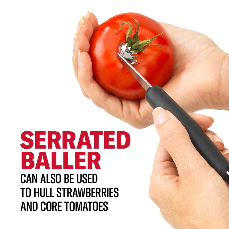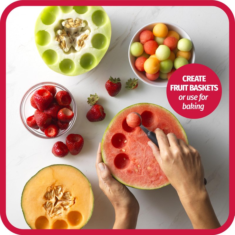 - SMOOTH SCOOP END: Serves as a fruit baller and is ideal for scooping perfectly round balls of watermelon, cantaloupe, kiwi, and honeydew for an attractive fruit platter or healthy bite-sized snacks