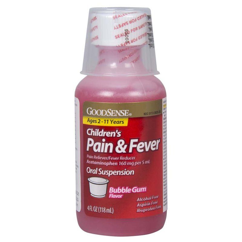 - BUBBLE GUM FLAVOR: GoodSense Children's Pain and Fever Oral Suspension relieves minor aches and pains due to common cold, flu, sore throat, headache, toothache, and also reduces fever. Bubble gum flavor pain reliever.