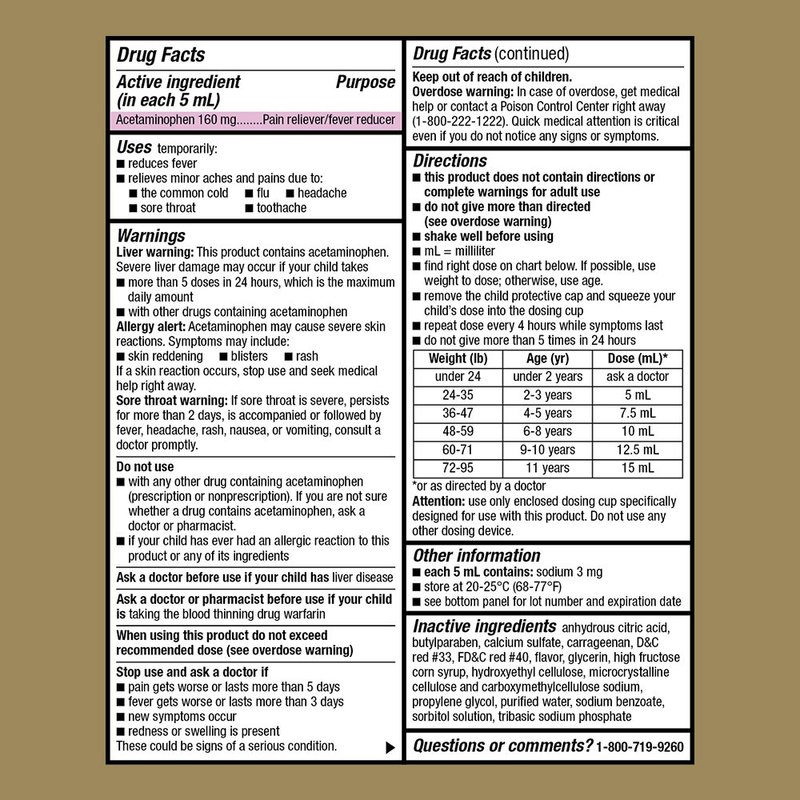- ACTIVE INGREDIENT: Children's Pain and Fever Oral Suspension contains acetaminophen 160 mg per 5 mL for fast, effective relief of fever and pain for children ages 2 to 11 years. Compare to the active ingredient of Children's Tylenol Oral Suspension