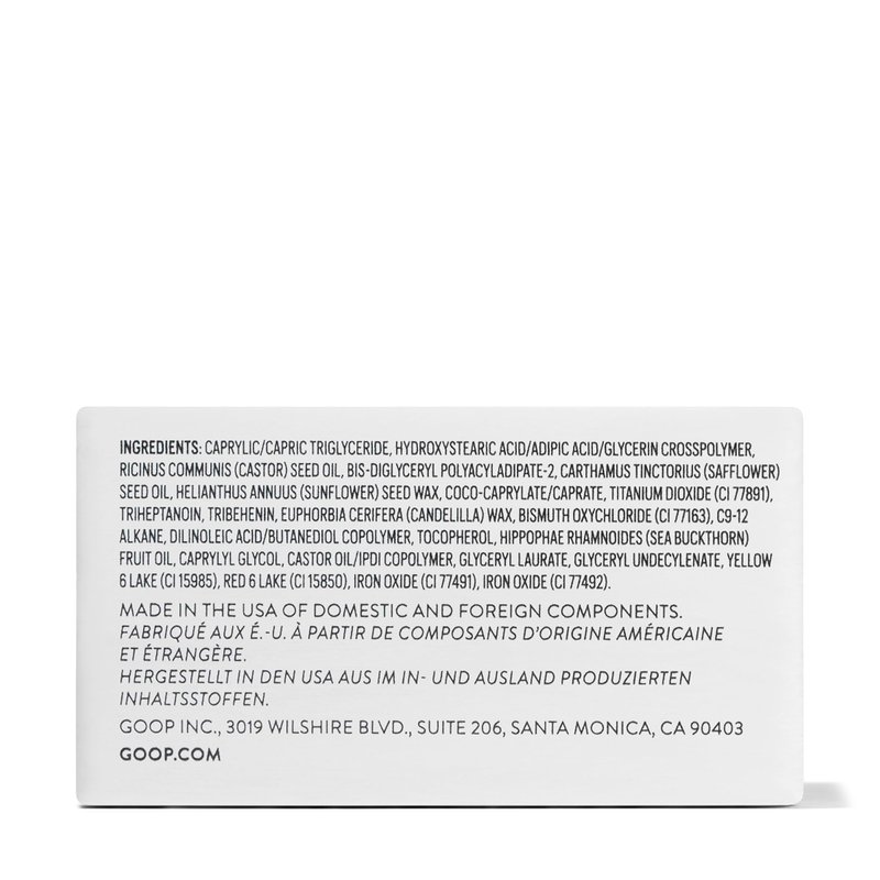 - Lip and Cheek Tint: goop Beauty's Colorblur Glow Balm delivers an effortless translucent pop of color that works anywhere the sun might hit your face—cheeks, lips, brow bones, temples, and beyond.