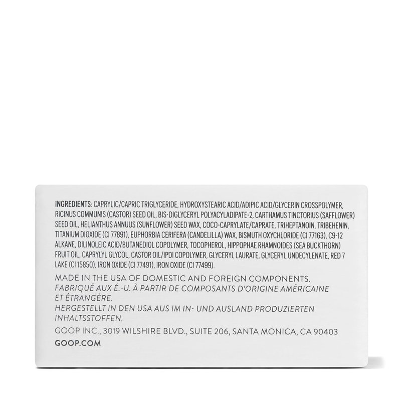 - Lip and Cheek Tint: goop Beauty's Colorblur Glow Balm delivers an effortless translucent pop of color that works anywhere the sun might hit your face—cheeks, lips, brow bones, temples, and beyond.