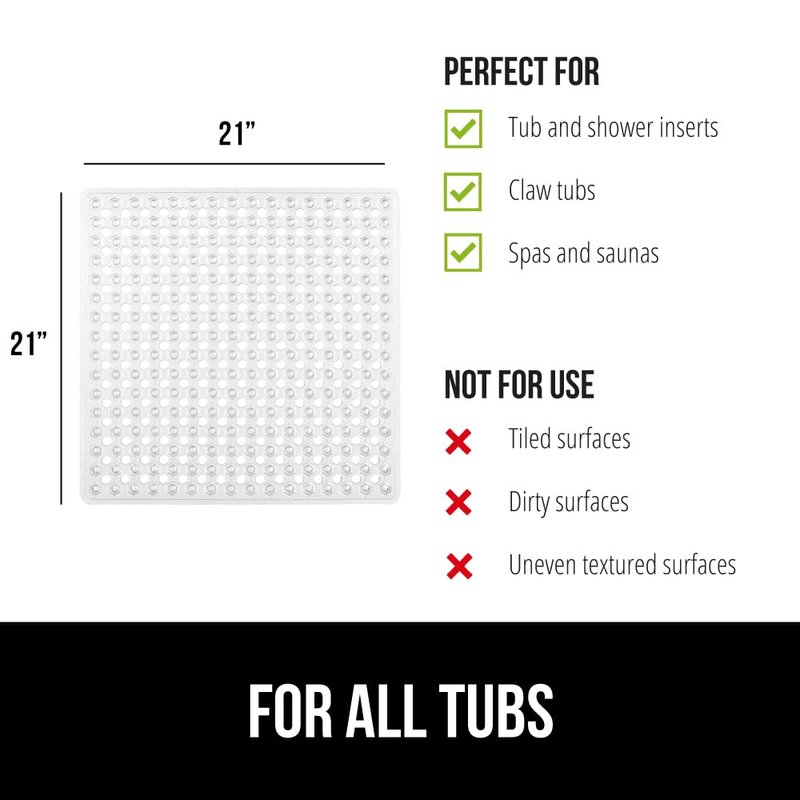 PATENTED DESIGN WITH POWERFUL SUCTION GRIP a shower mat designed to securely stay in place; the patented bathmat features hundreds of suction cups that effectively help secure the mat to your tub or shower floor EASY WATER DRAINAGE hundreds of drainage holes allow for water to easily flow under the mat and towards the drain, helping to prevent water from sitting stagnant under the mat in your shower TEXTURED AND BPA-FREE Our bath mats is constructed from BPA free materials; it features a unique hexagon design with a pebble textured topside that is soft on feet; shower mat is soft, flexible, and perfect for the whole family OVERSIZED AND MACHINE WASHABLE the shower mat is so easy to clean, simply machine wash and air dry; you can easily air dry the shower mat by hanging it over the side of the tub; square mat is conveniently sized 21” x 21” providing excellent coverage for standing showers FOR ALL TUBS shower mat fits all kinds of tubs and inserts; only install on smooth, clean, non textured and non tiled surfaces