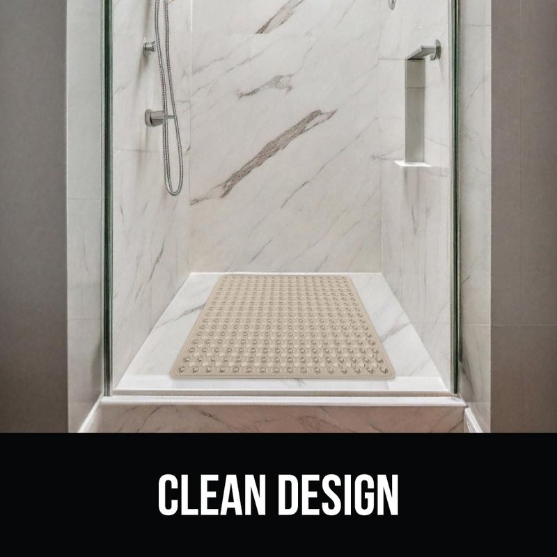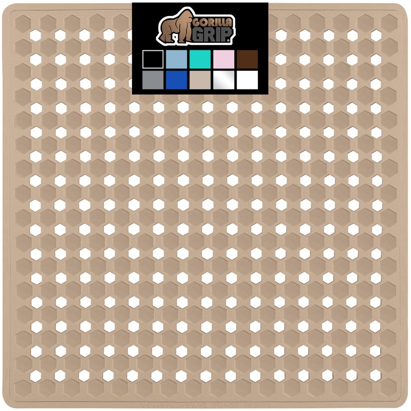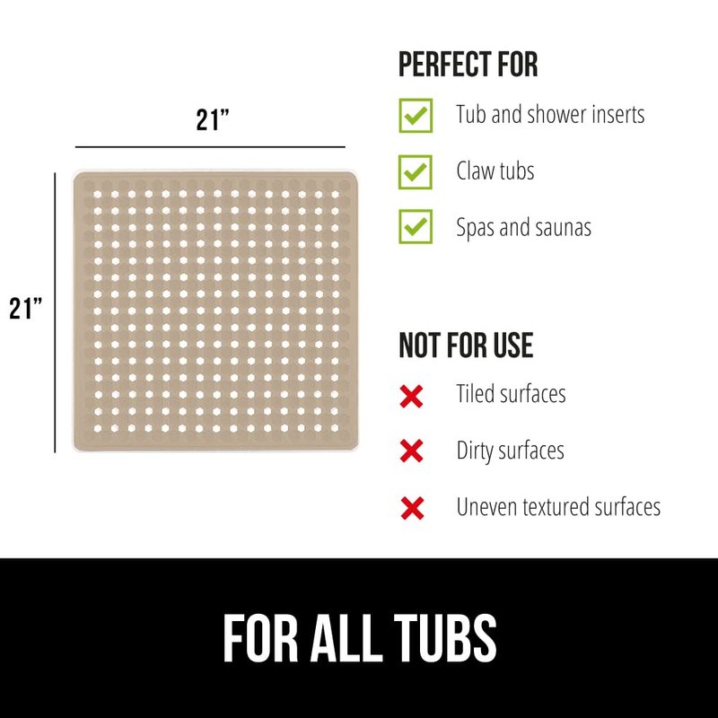 PATENTED DESIGN WITH POWERFUL SUCTION GRIP a shower mat designed to securely stay in place; the patented bathmat features hundreds of suction cups that effectively help secure the mat to your tub or shower floor EASY WATER DRAINAGE hundreds of drainage holes allow for water to easily flow under the mat and towards the drain, helping to prevent water from sitting stagnant under the mat in your shower TEXTURED AND BPA-FREE Our bath mats is constructed from BPA free materials; it features a unique hexagon design with a pebble textured topside that is soft on feet; shower mat is soft, flexible, and perfect for the whole family OVERSIZED AND MACHINE WASHABLE the shower mat is so easy to clean, simply machine wash and air dry; you can easily air dry the shower mat by hanging it over the side of the tub; square mat is conveniently sized 21” x 21” providing excellent coverage for standing showers FOR ALL TUBS shower mat fits all kinds of tubs and inserts; only install on smooth, clean, non textured and non tiled surfaces