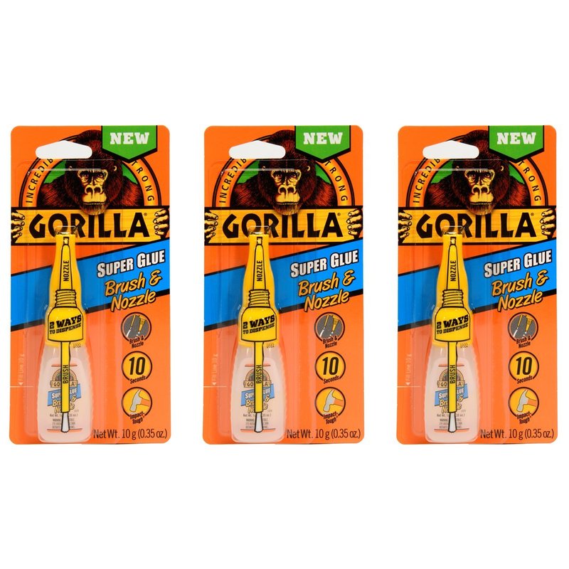 Gorilla Super Glue with Brush & Nozzle Applicator, 10 Gram, Clear, (Pack of 3)