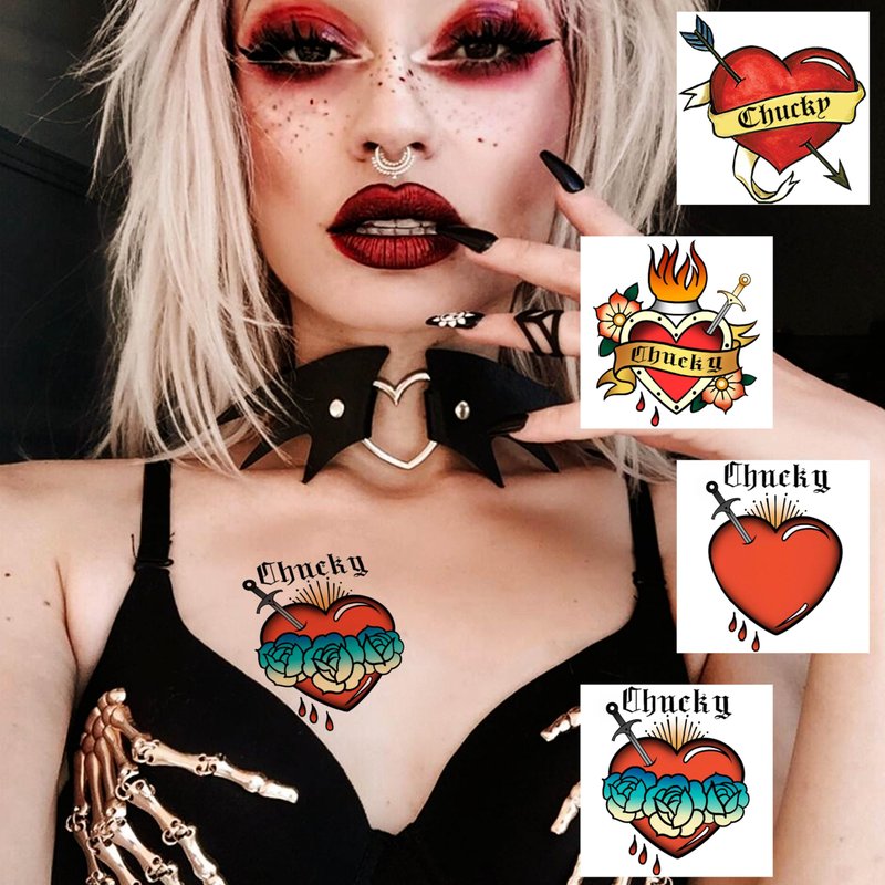 - π[Safty And Easy Applied Chucky Heart Tattoos For Adults] This Is A Good Choice To Make You Feel Realistic And Painless Tattoos. Our Disposable Temporary Tattoos Stickers Made Of Safe Non-Toxic Ink. When You Want To Use It, You Need To Tear Off The Surface Of The Film, Then Completely Soak It With Water, Turn It Over And Cover It On The skin And Wait For 10-20 Seconds. When You Remove The Sticker, You Will Find Realistic Tattoos Appear On Your Skin.