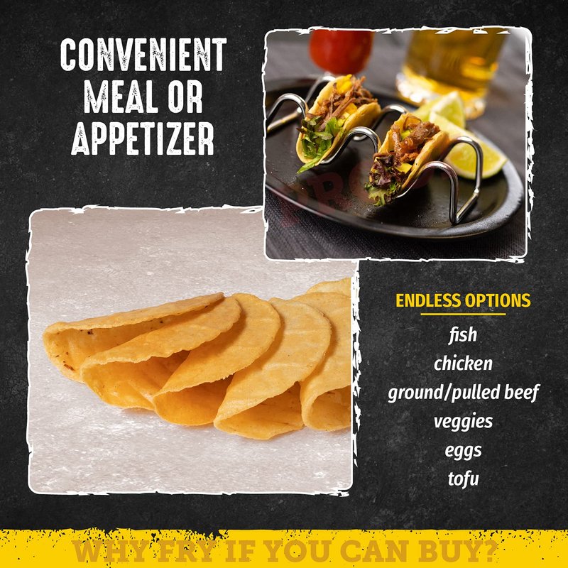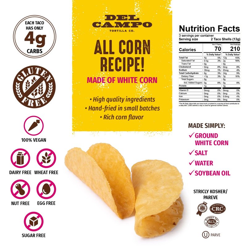 ARE YOU LOOKING FOR A TACO SHELL THAT TASTES FRESH AMD DOESN'T CRUMBLE ? Rich corn flavor , lightly fried and crisp. Authentic Mexican Restaurant. Impress and delight your guests and family.These mini tacos fit right in your hand , a delicious 2-bite appetizer when filled with shredded beef , chicken , or fish, etc.Ready to fill , serve, and eat right out of the box! Option to reheat briefly in medium heat oven before or after filling. Gluten free , made in a dedicated Gluten Free Facility. sTRICTLY Kosher and parve. OU and CRC Supervison. Vegan. 3 month shelf life when sealed and stored in cool, dry location. Can be frozen.