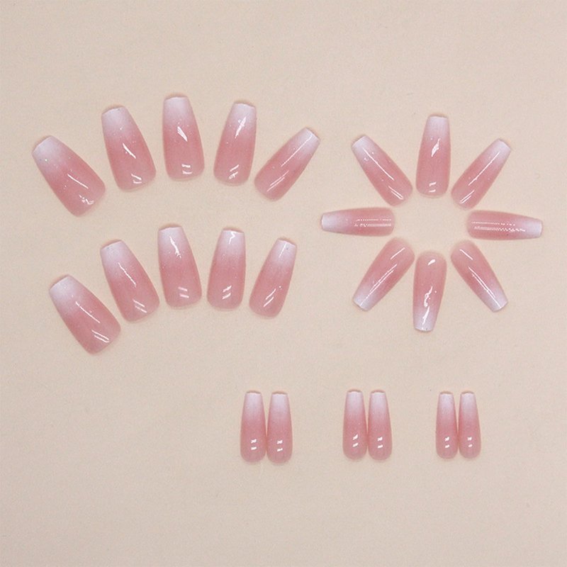 - Package Contains:You will get 24Pcs gradient pink fake nails with design press on nails in 12 sizes, 1 nail file and 24 jelly glues,1 small wooden stick.