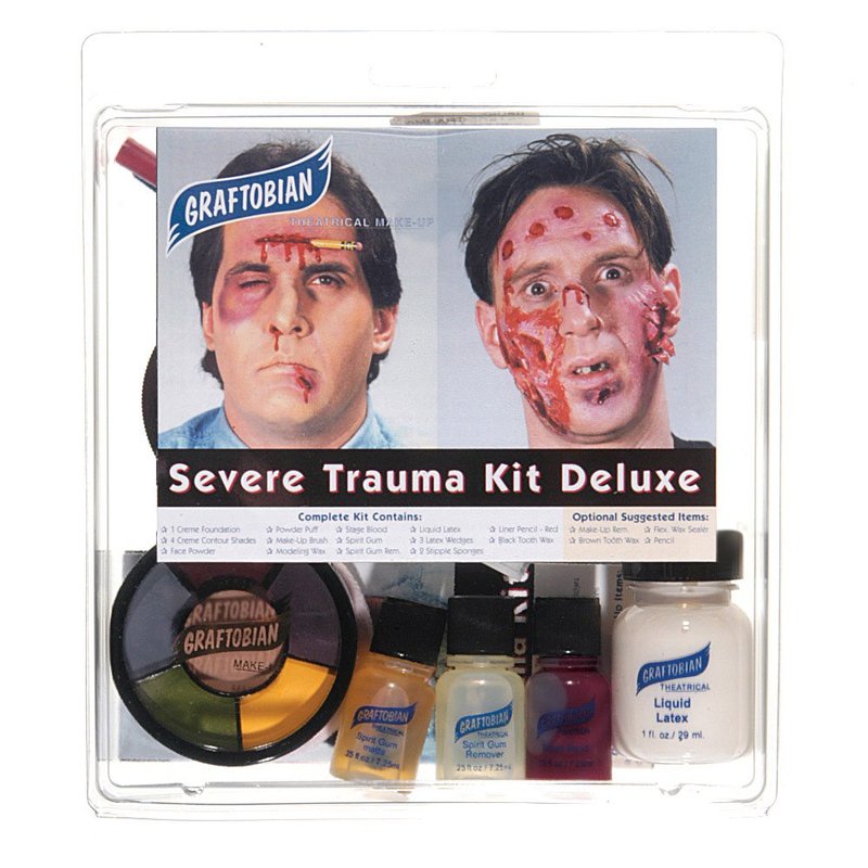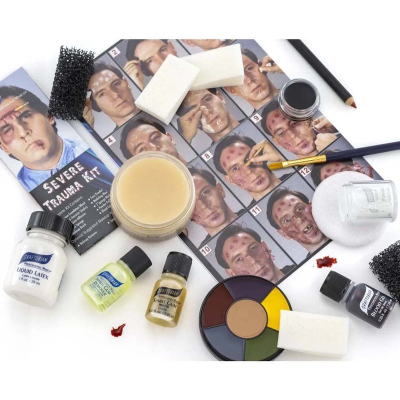- Kit includes: Severe Trauma Wheel, Powder and Puff, Blood Gel, Spirit Gum & Remover, Modeling Wax, Liquid Latex, Black Tooth Wax, Lining Pencil, Stipple Sponges, Latex wedges, Detail Brush, Full Color Instructions