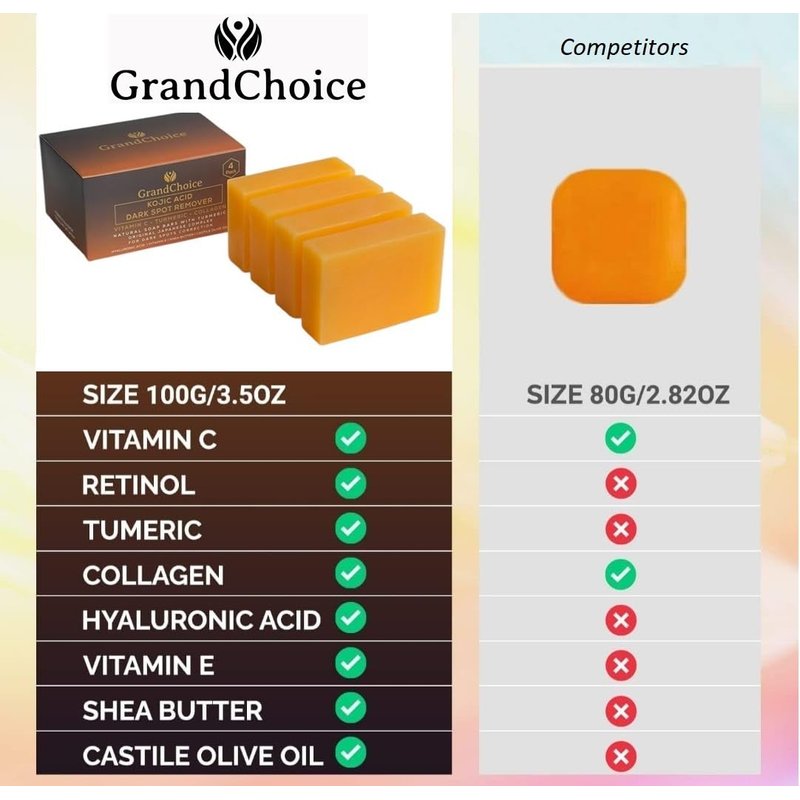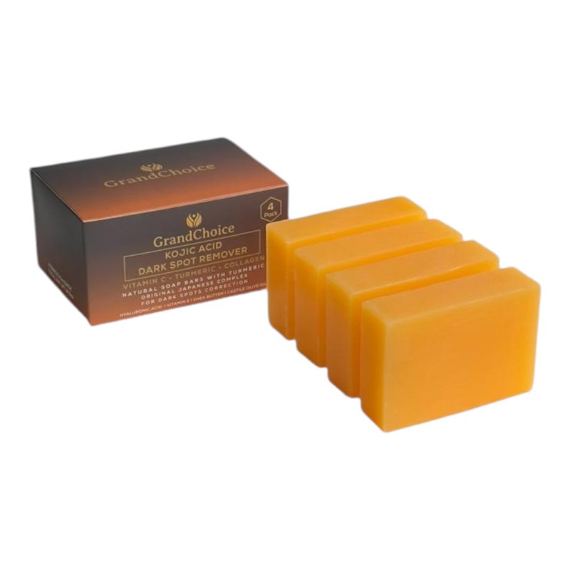 Grand Choice Kojic Acid Dark Spot Remover Soap Bars with Vitamin C, Retinol, Collagen, Turmeric - Original Japanese Complex Infused with Hyaluronic Acid, Vitamin E, Shea Butter, Castile Olive Oil Original Japanese Complex for dark spot areas, Promotes a balanced, more even tone and a healthy glow. Rejuvenating and exfoliating. Improve your skin texture, face acne marks, reduces dark skin spots even skin tone.