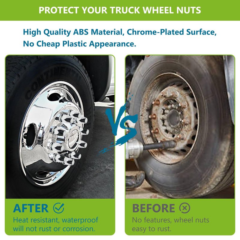 - 【HIGH QUALITY MATERIALS】: Our lug nut covers are made of high quality ABS material,, which is strong and durable. Chrome finish, high gloss. Heat resistant, waterproof and prevent rust. In addition, the semi truck lug nut cover has a flat top shape feature, which is stylish and beautiful, perfect for your beloved truck.