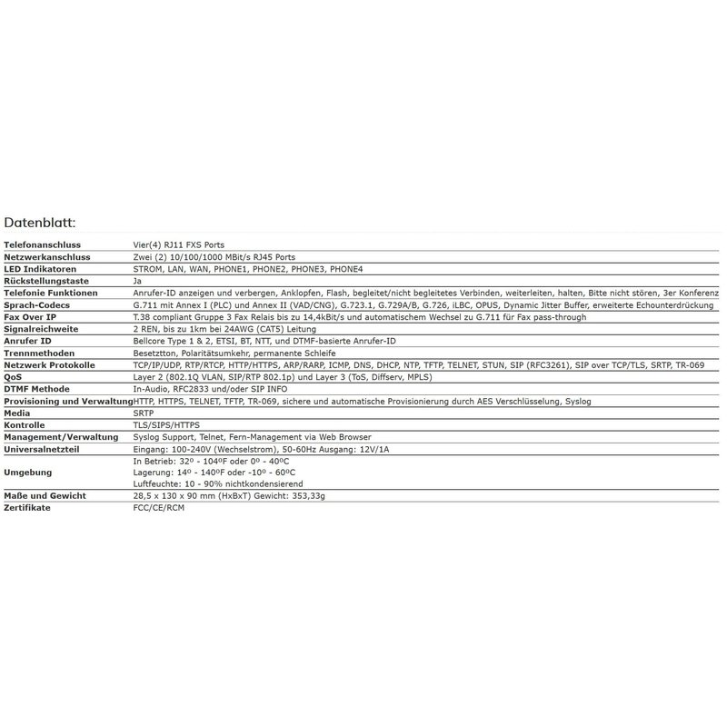 • Supports 4 SIP profiles through 4 FXS ports and dual Gigabit ports Includes a built-in Nat router which can handle routing speeds up to 100Mbps. Include TR-069 and XML Confit files Failover SIP server automatically switches to secondary server if Main server loses connection