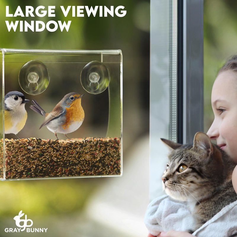 - DURABLE YET LIGHTWEIGHT: Crafted with a thick acrylic frame with large viewing window so that you can examine beautiful songbirds in vivid detail. This clear bird feeder is both sturdy and lightweight, ensuring long-lasting performance. Attach to a high window sill on your home to prevent squirrels from reaching it.