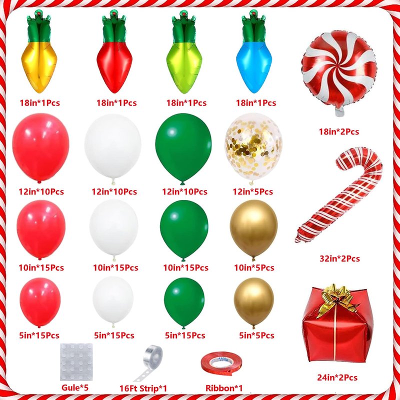 - CHRISTMAS BALLOON ARCH KIT - Packaging includes red balloons (12 in*10, 10 in*15, 5 in*15), white balloons (12 in*10, 10 in*15, 5 in*15), dark green balloons (12 in*10, 10 in*15, 5 in*15), metallic gold balloons (10 in*5, 5 in*5), confetti balloons (12 in*5), candy balloons*2, candy cane balloon*2, gift box balloon*2, light bulb balloon*4, balloon ribbons, 16 feet of balloon strips, 100 dots of glue.