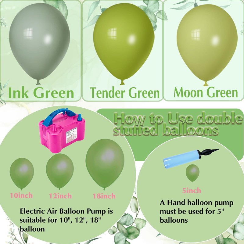 - 【Moon Green Balloon Garland Easy to Assemble】Our green balloon arch kits are chic, fun, and surprisingly easy to put together - no experience required! Inflate all the balloons first, then prepare the balloon decoration chain,Put the balloons into the hole of the balloon trim. Different size and different color balloons can be put on both side hole.You can also choose several colors to mix and match with an elegant balloon garland