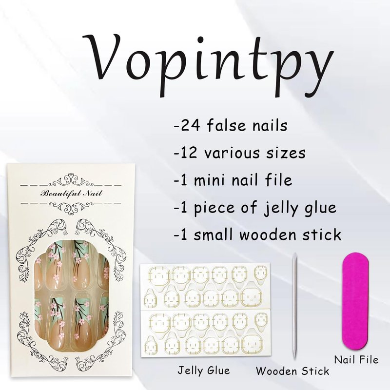 - 【Package & DIY Nails】You'll get 24 false nails in 12 sizes. 1 mini nail file, 1 small wooden stick, 1 piece of adhesive tab glue. You can safely choose a fake nail that fits your finger size and DIY your desired nail shape.
