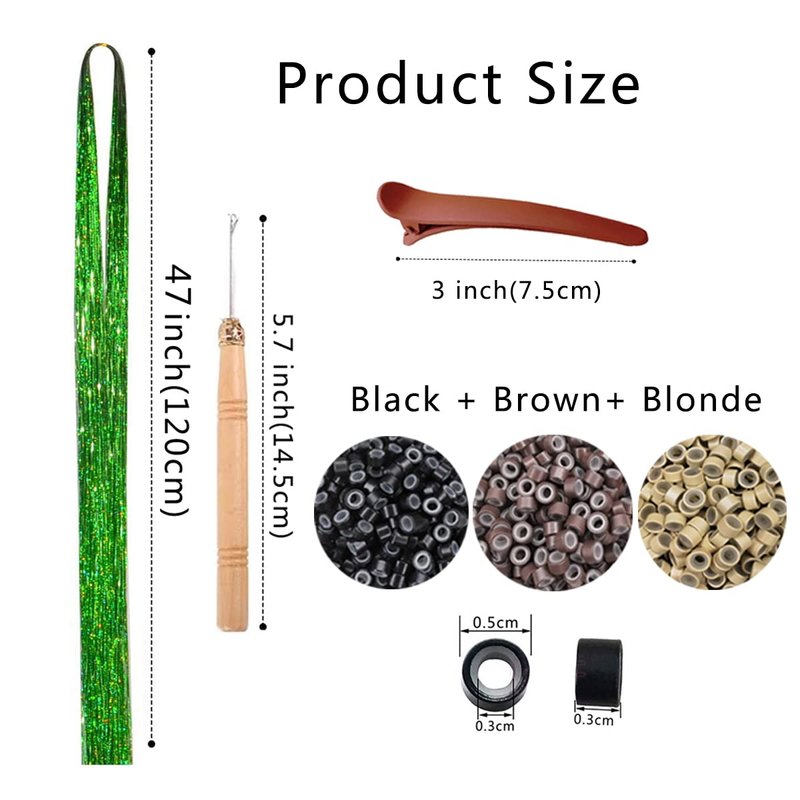 - Package Includes: 47 inches 1000 Strands Glitter Tinsel Hair Extensions. (5 bundles are fold packaged separately, total 1000 strands). Come together with 1 piece crochet, 1 piece hair clips, 100 pieces (Black + Brown+ Blonde) silicone micro beads.