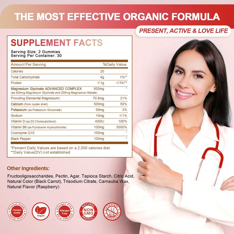 - Made with Wholesome Ingredients: Our magnesium glycinate gummies with magnesium glycinate, vitamins D, B6, calcium, potassium, etc; Added vitamin B6 can help magnesium work better, and Potassium helps support the immune and boosts energy