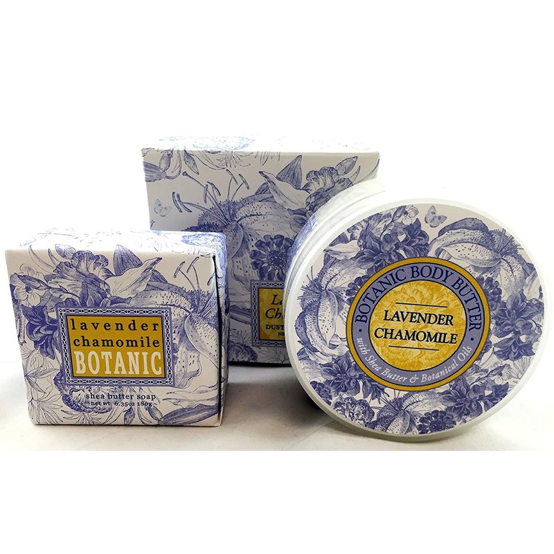 Greenwich Bay LAVENDER CHAMOMILE 3 Piece Beauty Gift Set of : BODY BUTTER, SPA SOAP, and DUSTING POWDER