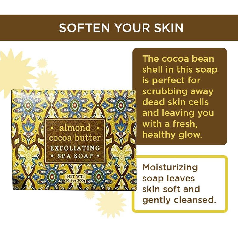 French-milled, luxurious vegetable soaps enriched with shea butter, cocoa butter & almond oil and blended with exfoliating cocoa bean shell