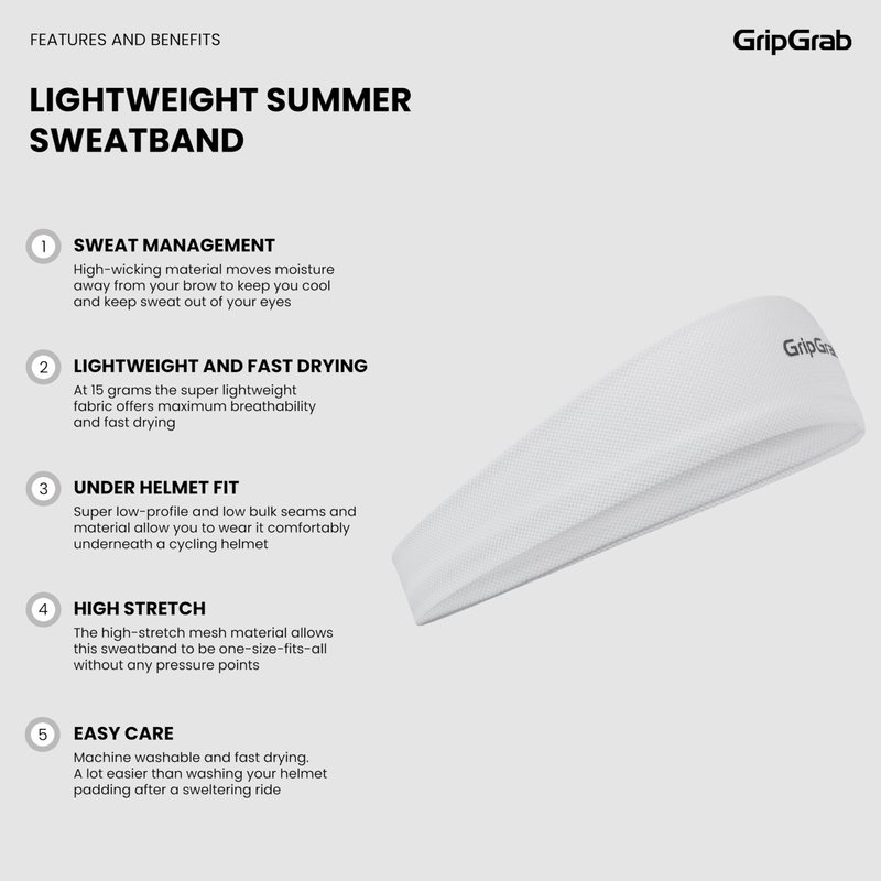 The GripGrab Lightweight Summer Sweatband is a soft and extremely lightweight fabric cycling headband that helps prevent sweat from running into your eyes. It fits perfectly under a bicycle helmet and effectively wicks away perspiration. Ideal for cycling, running and other activities in hot conditions. No matter what type of bicycle you cycle - road, mountain or gravel bike - sweat in your eyes or on your shades is annoying. The GripGrab Summer Sweatband wicks sweat away quickly, giving you a clear vision of the road or trail ahead. In contrast to classic sweat bands for tennis etc., this headband is designed specifically to fit under cycling helmets. Bear in mind that the sweating behaviour is very different for each individual and also depends on other factors such as wind, temperature, humidity, your bicycle helmet and exercise intensity. When you are in spinning classes or indoor cycling, where there is no cooling wind, the sweatband can't dry as quickly as it can when riding outdoors, for example descending a climb. In order to comfortably fit under a helmet, this sweatband is rather thin, adding to its quick-dry properties. However, it also means that it can't absorb as much sweat as a thicker, heavier cotton sweatband. This piece of headwear is a unisex item for men and women. Product Details: Material: 80 % Polyester, 20 % Elastane. Colours: Black, White. Size: Onesize (21 - 25 inch head circumference) - Please consult the size guide in the product images for further information.