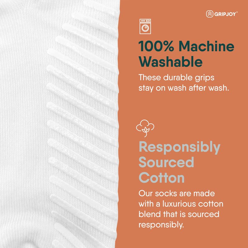 Step confidently with Gripjoy Compression Socks - the ultimate slip-proof solution for your feet! Gripjoy socks have discreet, non-slip grips to give you traction as you stand and walk, especially on slippery wood and tile floors. This also reduces your risk of injury from slipping and falling. Our compression socks offer support at 15-20 mmHg. This makes it ideal for daily use to help boost blood flow and reduce swelling. They can also help combat muscle soreness and fatigue in the legs and feet, so they are perfect for those who are active, pregnant, or always on the go. The socks are made with a luxurious cotton blend, so they're comfortable while providing the right level of support. They also come in beautiful designs, so you’ll love using them regularly. Gripjoy socks are for everyday wear by anyone who wants life to be a little less slippery, including parents, grandparents, and child care providers chasing little ones around; post-surgical patients working towards a recovery; pregnant and postpartum women protecting their most precious gift; elderly individuals seeking greater independence; toddlers taking their first steps; athletes perfecting a yoga pose; those choosing to thrive in the face of a disability; kids running wild in the house; and so many more. About Gripjoy: We’re proudly family run and headquartered in Chicago, USA. Gripjoy was formed in 2018 with a goal of creating beautiful, purpose-driven socks with grips for those who could use a little extra “grip” in their day-to-day lives. We pour our heart into designing each of our styles and take great joy in empowering others to live more confident, independent lives through our thoughtfully crafted socks. From our family to yours, we wish you joy in every step of your journey!