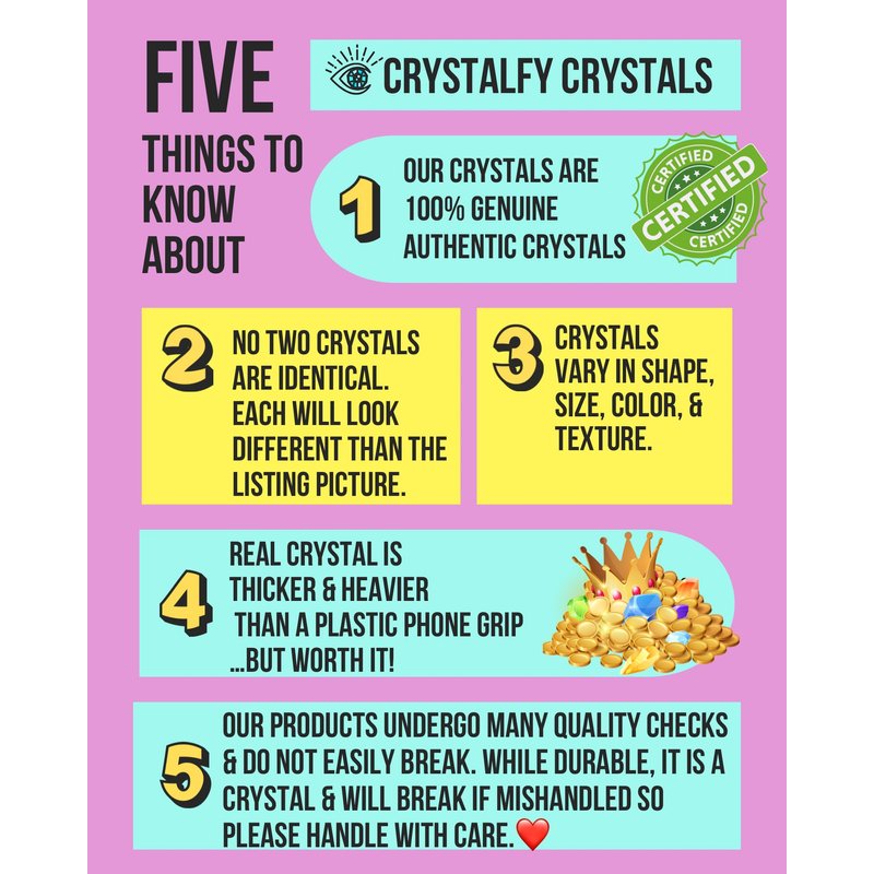 Manifest Like Magic with CRYSTALFY Phone Grips. Elevate your energy and attract positivity with CRYSTALFY's phone grips, powered by natural, authentic gemstones. A SELF-LOVE and SELFIE tool with a unique 360-degree rotating grip features a soft, ergonomic hold and expands or collapses easily with a built-in kickstand. The swappable crystal top, made from real gemstones brings the healing power of crystals into your everyday life. Reiki-cleared and charged with positive intentions, this phone grip promotes self-love, emotional balance, and a higher vibrational frequency. Upgrade your phone accessory game with a tool that nurtures your mind, body, and spirit while making you a magnet for good things. 🖤SHOP OUR FULL COLLECTION - Visit our storefront to discover a wide range of swappable crystal phone grips, offering unique designs and customizable options to match your style! 🖤WE HAND-SELECT OUR CRYSTALS TO ENSURE OUR HIGHEST STANDARDS ARE MET - These are actual photos (not stock images) of our crystals. Photo lighting and screens/monitors may make colors appear slightly different. The crystalline structure of the crystal can have natural blemishes, colors, cracks and holes that are beautiful in their natural way. 🖤GRIP IT. STAND IT. SPIN IT. SWAP IT - Our phone grip features a soft silicone base for comfort, a swappable crystal top that spins 360 degrees, and a design that expands with a pull, collapses with a push, and kicks out as a stand for hands-free video streaming. 🖤100% AUTHENTIC & UNIQUE - These are natural gemstones made by nature, not mass-produced, each piece one-of-a-kind in shape, size, and look. No two crystals are identical, so you’ll notice variations in color, size, veining, opacity, light-reflecting lustre, and hardness. As real crystals, they are heavier and thicker than standard plastic grips, offering a premium, authentic feel. 🖤PACKAGED WITH LOVE & LUXURY IN A VELVET BAG FOR SWAPPING CRYSTALS AND GIFTING - Packed with loving vibes in a black velvet bag great for gifting and carrying extra CRYSTALFY crystals to swap. 🖤THE NITTY GRITTY - Uses advanced reusable adhesive that is repositionable and washable. PLEASE NOTE: The base of the crystal phone grip adheres to most hard plastic cases but may not adhere well to some soft/silicone, waterproof or heavily textured cases (ie.,leather or glitter). Will not stick to waterproof, glass-backed phones iPhone 11 Pro or iPhone 11 Pro Max without a suitable case. 🖤HOW TO ATTACH PHONE GRIP- 1. Crystal & phone should be at room temperature 2. Clean phone or case with alcohol & dry. 3. Peel white sticker from back of phone grip. 4. Position grip & press firmly holding the edge of crystal for 3 minutes or more. 5. For strong adhesion, do not use grip for 3 hours or more. 6. Extra sticker included for future use when changing cases. 7. Handle with care preventing falls or impact to hard surface. Extreme temperatures, water or sunlight can weaken the crystal. 🖤HOW TO SWAP YOUR CRYSTAL – 1. Fully expand grip open. 2. Pinch or press in center part of gripper. 3. While pressing center of grip, turn the crystal top to twist the tabs loose from the 4-tab openings. 4. To swap the new crystal on the gripper, line up the 4-tabs under the crystal with the openings on the top of the gripper. 5. Insert the 4 tabs in each opening and twist the crystal top to ensure tabs under the crystal are locked in place.