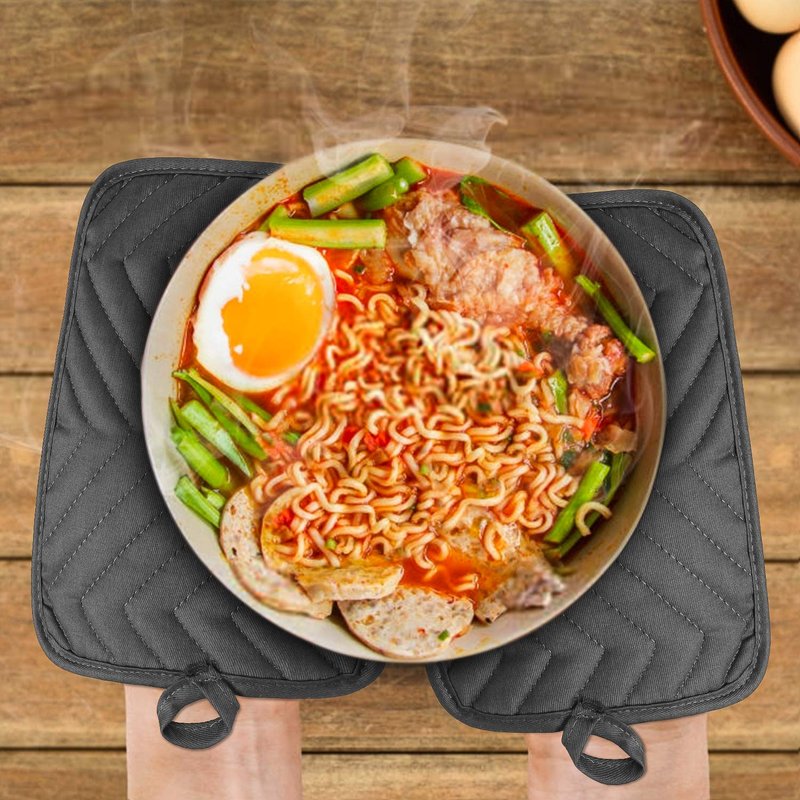 Pot Holder Sets are made of durable and comfortable Cotton, quilted to offer durability and flexibility for a better grip on hot pots. Designed with your safety in mind and to shield hands from heat when cooking and handling hot pots and pans. Heat resistant, protect your hands while handling hot pots, pans, dishes, casserole dishes and more.