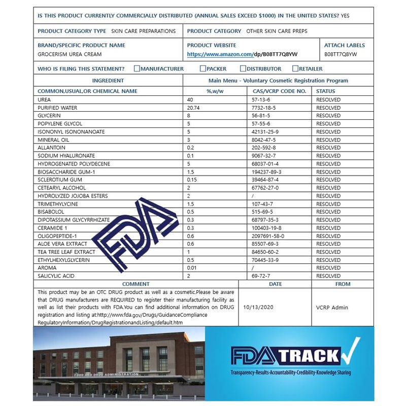 - 【Organic Ingredients】Water, Urea, Glycerin, Propylene Glycol, Isononyl Isononanoate, Mineral oil, Allantoin, Hyaluronic Acid, Hydrogenated Polydecene, Salicylic acid,Biosaccharide Gum-1, Sclerotium Gum, Cetearyl Alcohol, Trimethylglycine, Bisabolol, Dipotassium Glycyrrhizate, Ceramide 1, Oligopeptide-1, Aloe Vera extract, Tea Tree Leaf Extract, Ethylhexylglycerin, Aroma, Hydrolyzed Jojoba Esters