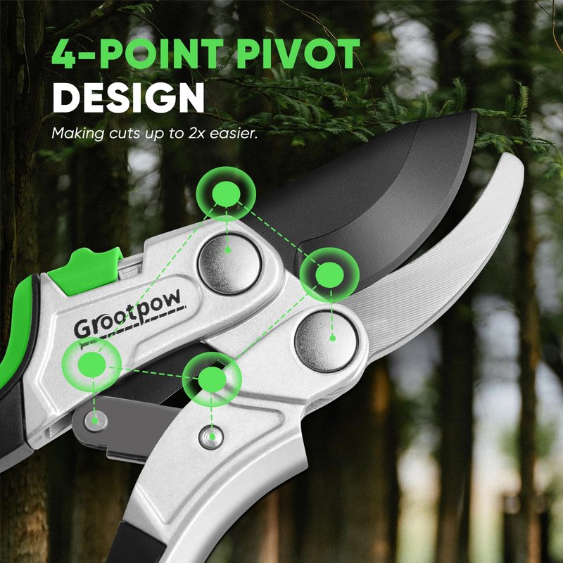 Grootpow PPS01 Premium Bypass Pruning Shears, Aluminum Construction Garden Clippers with SK5 Carbon Steels Blades, 4-Point Pivot Design, 5/8” Garden Shears with Ergonomic Handles for Gardening