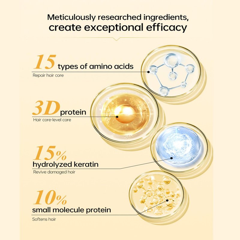 - 【Mild Ingredients】: The formula specially developed for hair damaged by hot dyeing contains 15 kinds of natural amino acids to supplement hair nutrition. Formulated with 15% hydrolyzed keratin to quickly repair damaged hair. Combined with 10% small molecule protein, it deeply nourishes the hair core, repairs the hair from the inside to the outside, and immediately repairs the hair damaged by perm and dyeing, making the hair soft, smooth, moist and shiny.