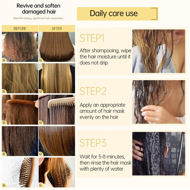 - 【Keratin Hair Mask】: The main ingredient of our no-wash hair mask is keratin, which is also one of the important ingredients for hair growth. It is highly concentrated in every particle of our no-wash repair hair mask. When the hair mask stays on the hair When used, it can instantly replenish nutrients to the hair, fill the holes and cracks caused by external damage such as dry environment, repeated perming and dyeing, improve fragile hair, reduce hair breakage, enhance the strength of the hair,