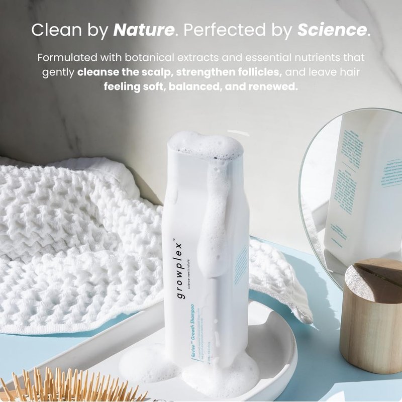 Revive by Growplex is a lightweight, revitalizing shampoo formulated to help improve the appearance of thinning hair. Powered by botanical and scientifically supported ingredients like caffeine, rosemary oil, and biotin, this sulfate-free formula helps cleanse and nourish the scalp for hair that looks and feels fuller, stronger, and healthier. Designed to support scalp wellness and hair vitality, Revive helps reduce breakage, improve manageability, and promote the look of denser, more resilient strands. Menthol offers a refreshing sensation while niacinamide and wheat protein support overall hair texture and strength. Gentle enough for daily use and suitable for all hair types including color-treated Revive works best when paired with Replenish Conditioner as part of your complete Growplex routine.
