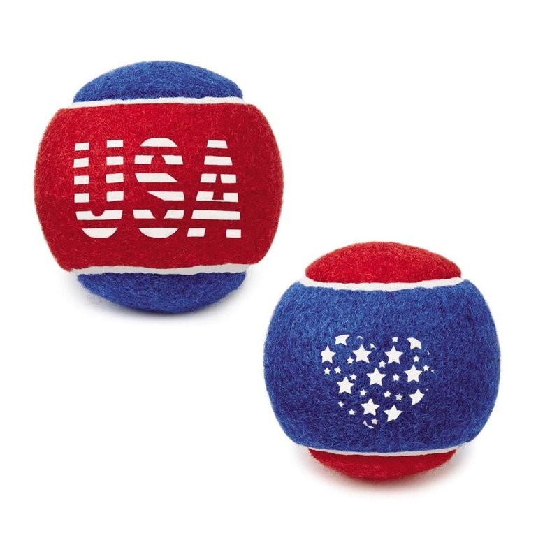 Stars & Stripes Dog Tennis BallsHandy 6-packs of Stars and Stripes Tennis Balls make it easy and economical to maintain stock of one of dogs' favorite toys.These red-and-blue Stars and Stripes Tennis Balls 6-Packs feature USA on one side and a heart made out of stars on the other.Size: Each has a 2½ diameter.