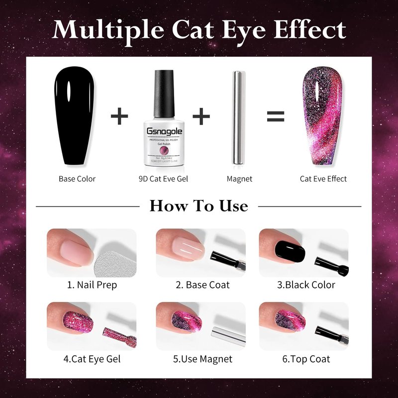 - The GSNAGOLE 9D Reflective Cat Eye Gel Nail Polish Set includes 1 bottle of 9D Reflective Cat Eye Gel Nail Polish, 1 bottle of black base coat gel nail polish, and 1 magnetic stick. No need to purchase black nail polish separately, saving you money and time at the nail salon! Enjoy the fun of DIY manicures at home. Suitable for natural nails, artificial nails, acrylic nails, and more.