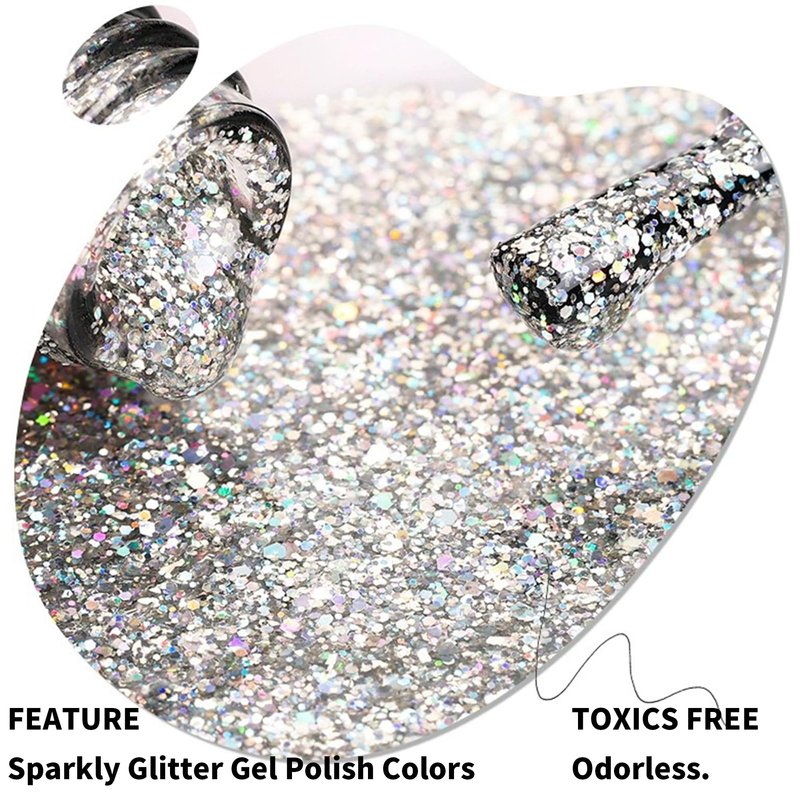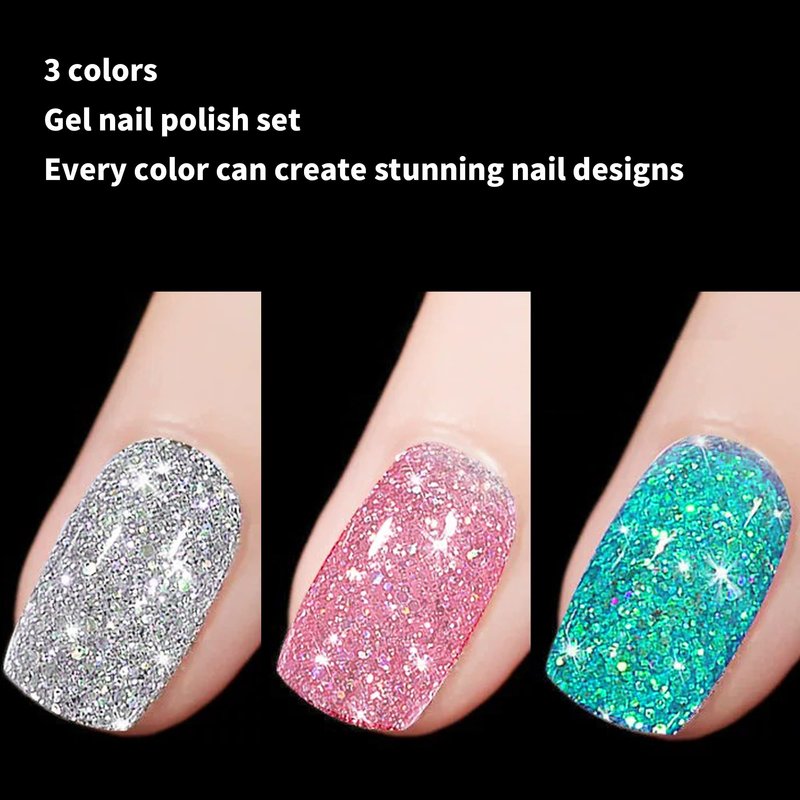 - ✨Package Contents: 3 bottles containing 10ml each of silver, pink, and green sparkling gel polish. This highly pigmented set features thick sparkling gel, a must-have for every nail technician and DIY enthusiast! The full set of glittering sparklers can be mixed and matched for any vibrant look!
