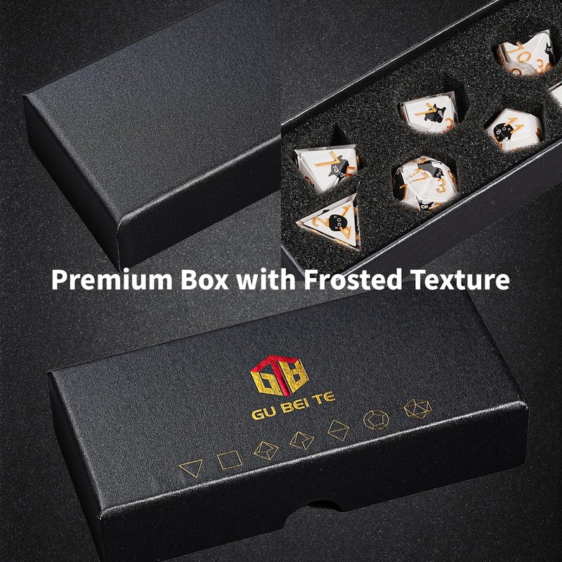 GU BEI TE Resin Dnd Dice, a must-have accessory for Dungeons and Dragons enthusiasts. This set of polyhedral dice features a unique and innovative design with cat style Resin, adding a touch of novelty to your gaming experience. Each set includes 7 pieces: D20, D12, D10, D%, D8, D6, and D4 dice, all enclosed in a convenient box and bag for easy storage and transport. With its mesmerizing cat style Resin Dice and very cute, the GU BEI TE Liquid Core Dnd Dice set is sure to stand out on your gaming table. Whether you're a seasoned player or just starting out, these unique dice are perfect for adding an extra element of fun and excitement to your adventure. Elevate your D&D game nights with the distinctive style of the GU BEI TE Liquid Core Dnd Dice set.