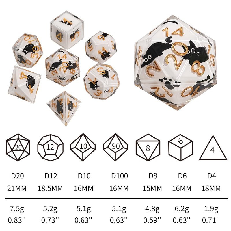 - Dnd Dice Set: This set includes D4, D6, D8, D10, D12, D20 and D% for a total of 7 dice, complete with dice box and dice bag. This resin dice set features cat elements.