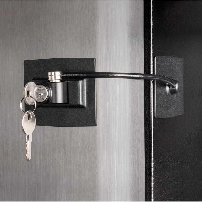 - SUPER STRONG! HIGH SECURITY! This high-quality keyed refrigerator lock will protect your medicines, alcohol, or even your lunch from getting into the wrong hands; The steel plates have a scratch-proof powder coat finish with a vinyl coated aircraft cable for strength