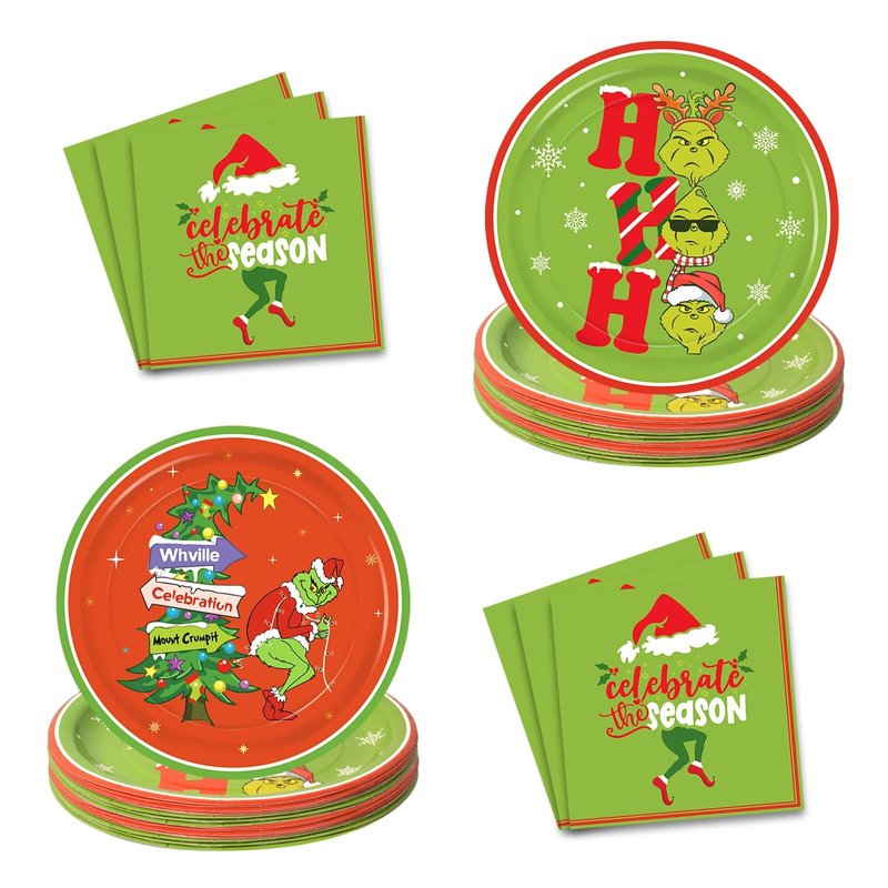 - VALUABLE PACK: The 32 pack christmas dinnerware set includes 16pcs dinner plates 9" and 16pcs napkins 6.4". They feature a classic image of the Christmas thief with the words "HOHOHO" and "celebrate the season", colored in red and green, great Christmas party supplies can greet 16 guests
