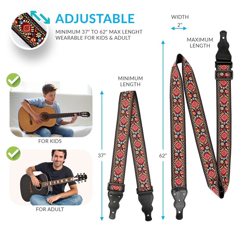 - Adjustable to your preferred length: feature a user-friendly adjustment system, allowing you to easily customize the length from to your preferred fit. Whether you prefer your instrument high or low, our bass guitar strap accommodates your playing style with precision. Adjusting size between 37" - 64" Length so it's guaranteed to fit you perfectly. men, women & children guitarists