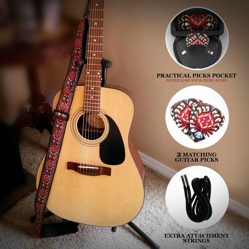 Guitar Strap For Acoustic Guitars , Electric Guitars and Bass , Red Vintage Woven Embroidered Adjustable Strap Includes 2 Strap Locks To Keep Your Guitar Safe & 2 Unique Picks and Pick Pocket