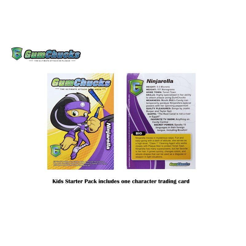 - Innovative Design: GumChucks Unique two-handled system allows you to create the Dentist-Recommended “C-Shape” technique while flossing. The only difference between the Adult and Kids Starter Packs are the handle colors, along with the collectible trading card being included in the Kids version only.