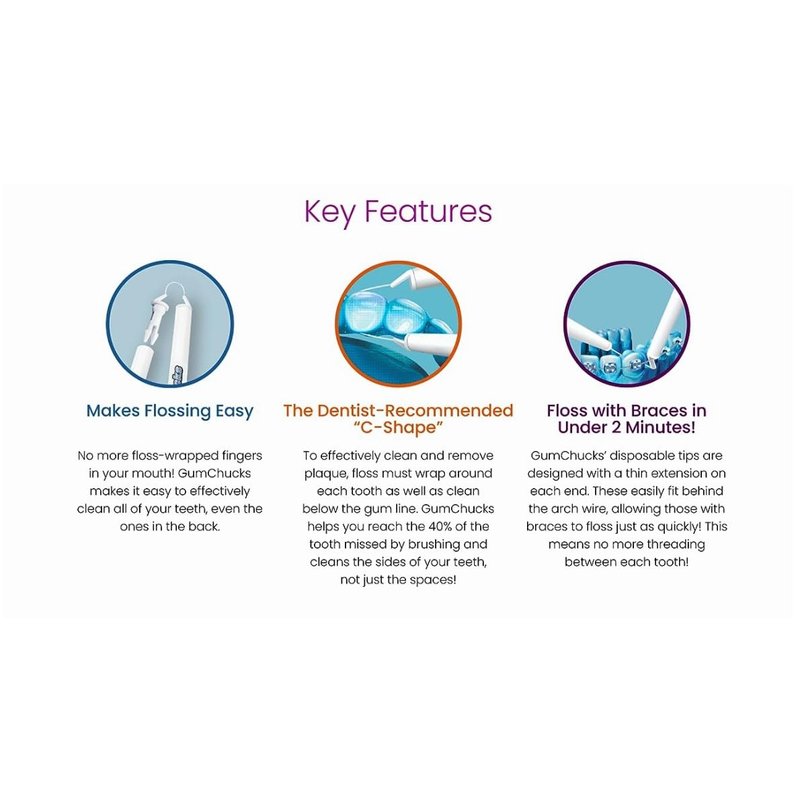 - Innovative Design: GumChucks Unique two-handled system allows you to create the Dentist-Recommended “C-Shape” technique while flossing.
