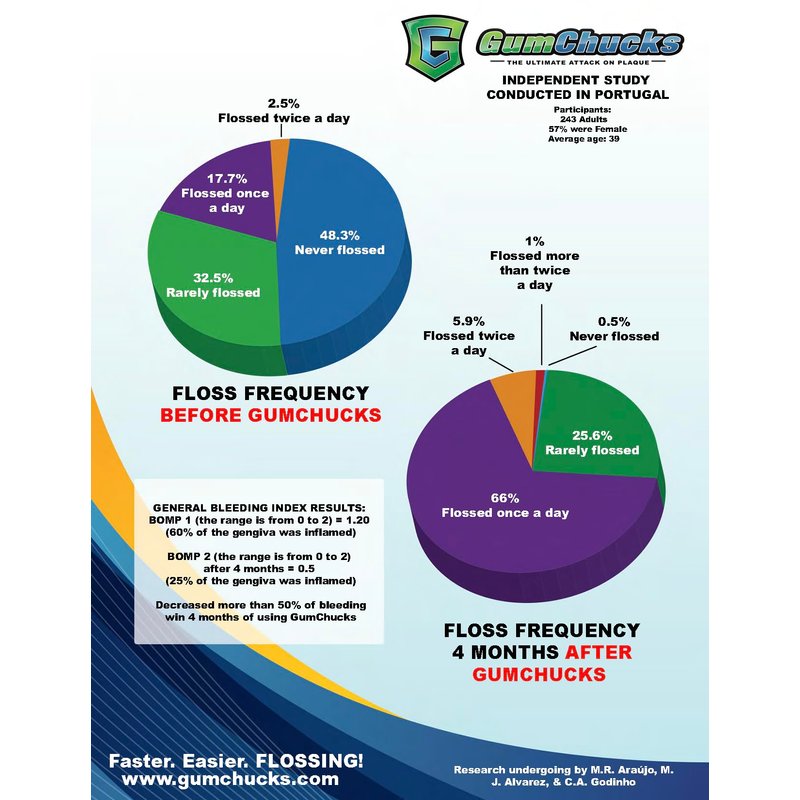 - Floss and Toss - Simply press the button to release the old floss pick. UCLA Study demonstrated that GumChucks makes flossing so easy and fast, that 73.7% of people who tried GumChucks became regular daily flossers!