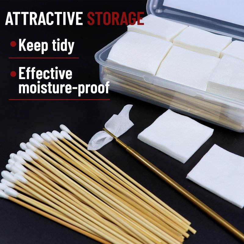 Firearms cleaning supplies includes: 300pcs gun cleaning pads and 200pcs long cotton swab. They are all packed in a transparent storage case, keep it easy to use and store, meet your cleaning need