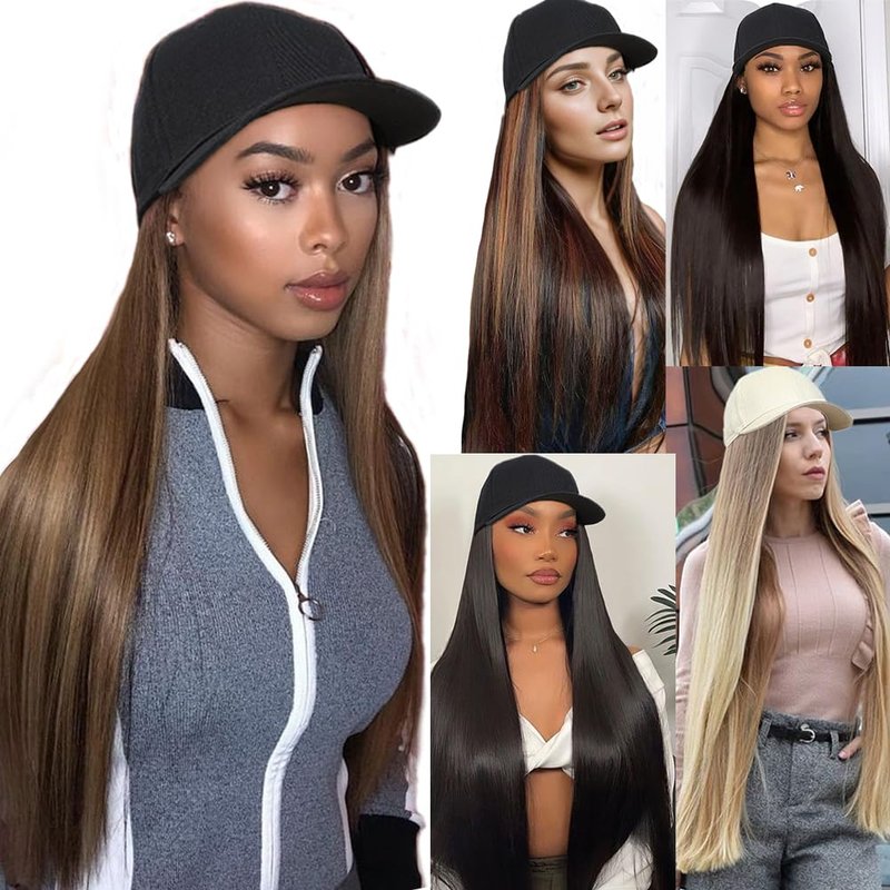 GUOJIAN Baseball Cap with Straight Hair Extensions 32inch Straight Long Hairstyle Adjustable Wig Hat Attached Synthetic Hairpiece for Woman (1B/99, 32Inch)