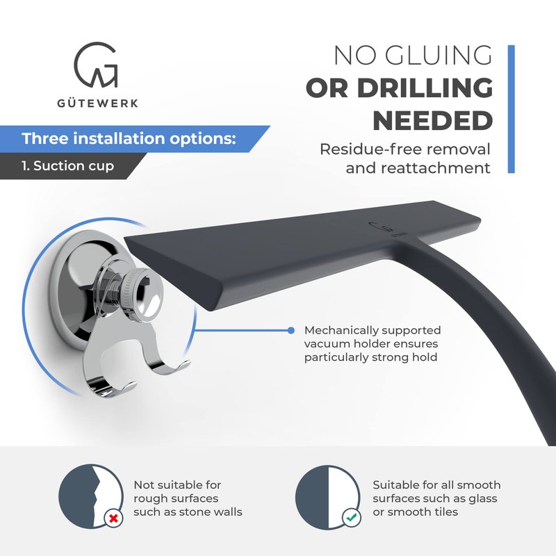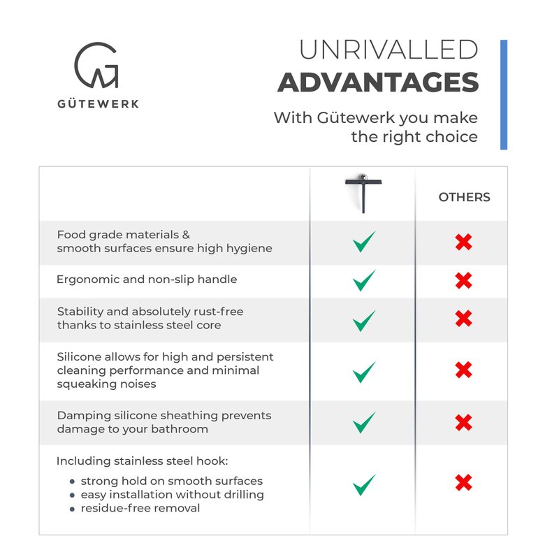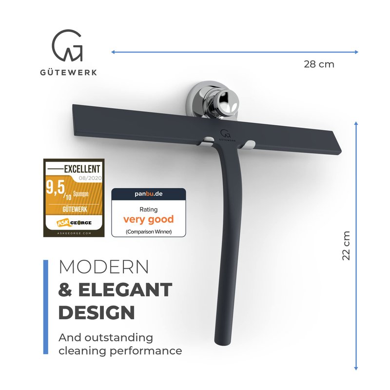 - MINIMALIST TIMELESS DESIGN - The GÜTEWERK glass squeegee is crafted with a matte black finish that impresses with its elegant timeless and smart design. In addition, the chrome-colored stainless-steel hook integrates well with any modern bathroom.