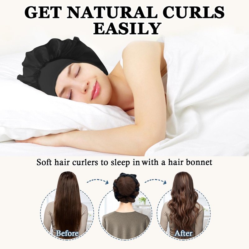 Gwabee No Heat Hair Curlers to Sleep In Overnight Curls Headband, 70" Long Soft Hair Curler No Heat Curling Headband Ribbon Curl Wrap for Long Hair Rollers, 9 PCS Curling Rods Set with Bonnet -Black