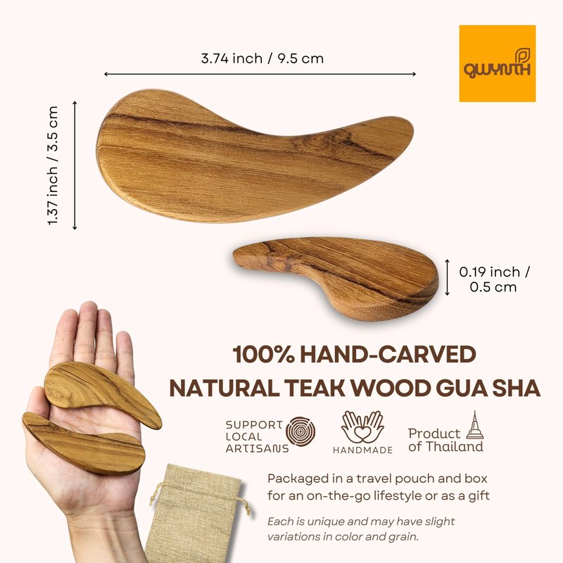 - 🌳DISCOVER THE MAGIC OF TEAK WOOD GUA SHA! Made from teak wood. This anti-static, lightweight Gua Sha tool is durable and crack-resistant. Each piece is handcrafted by skilled Thai artisans and showcases unique teak grain. Finished with olive oil, it offers healing benefits—reducing stress, restoring your nervous system, and promoting calm.